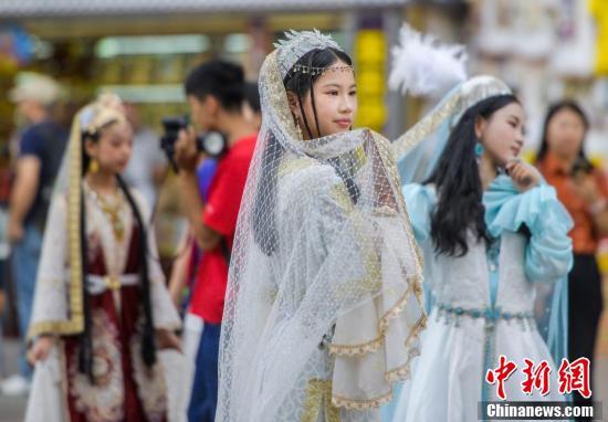 8月12日,新疆乌鲁木王人市大巴扎步行街,旅客一稔流程阅兵的民族衣饰拍摄高清写照照。中新社记者 刘新 摄