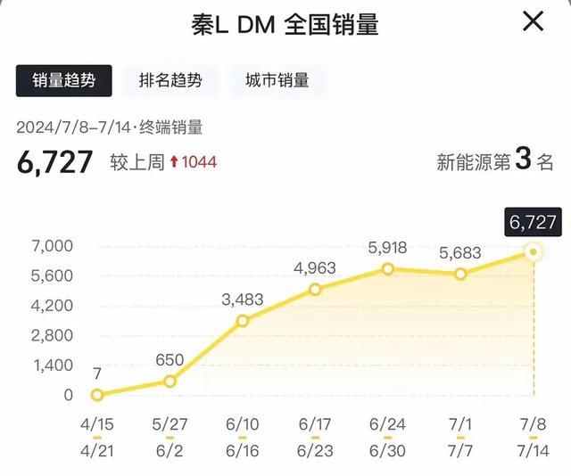 工业古迹比亚迪秦L,终于公布了7月第2周的周销量收获:累计录用达到6727台!环比增多1000多台,再度创造了录用据说,况兼这个数据还在节节攀升。