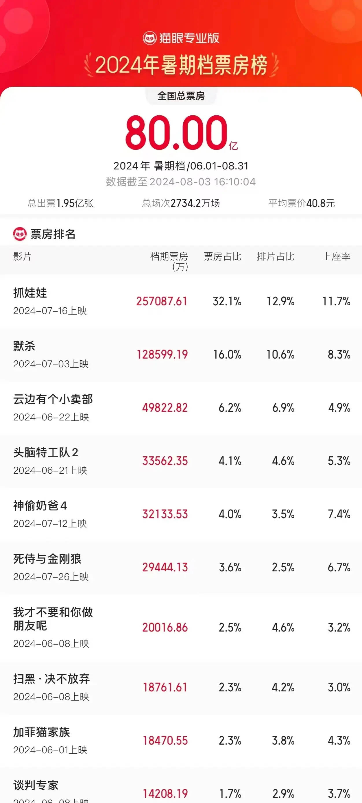 搜狐文娱讯 据猫眼专科版数据九游体育app娱乐,截止8月3日16时10分,2024年暑期档档期(6月1日-8月31日)总票房(含预售)冲破80亿,《执娃娃》《默杀》《云边有个小卖部》依旧稳坐档期票房榜前三位。