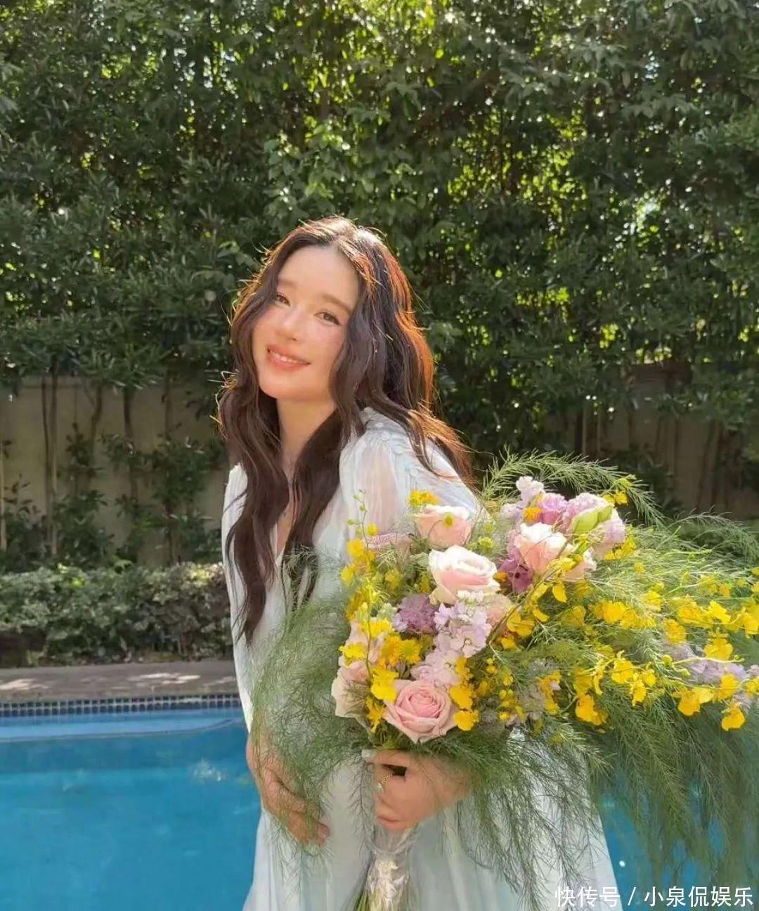 抱着一束粉黄相间的花束,手摸孕肚,笑意淡淡,站在阳光下的阚清子,一副岁月静好的神态。