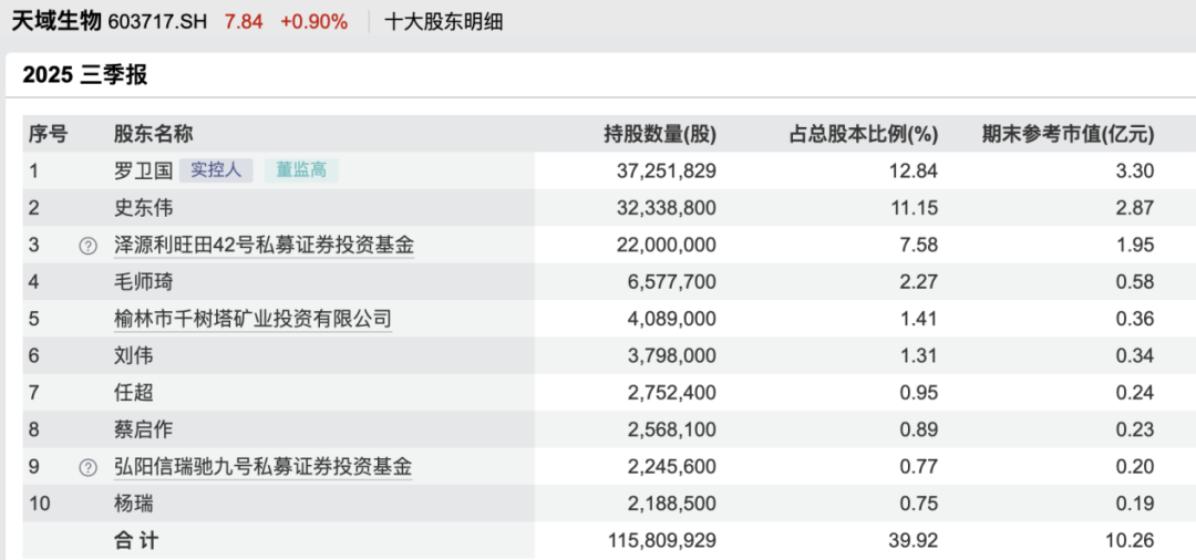 范畴2025年三季度末,罗卫国的抓股数目为3725.18万股,抓股占比为12.84%,为天域生物第一大鼓吹。