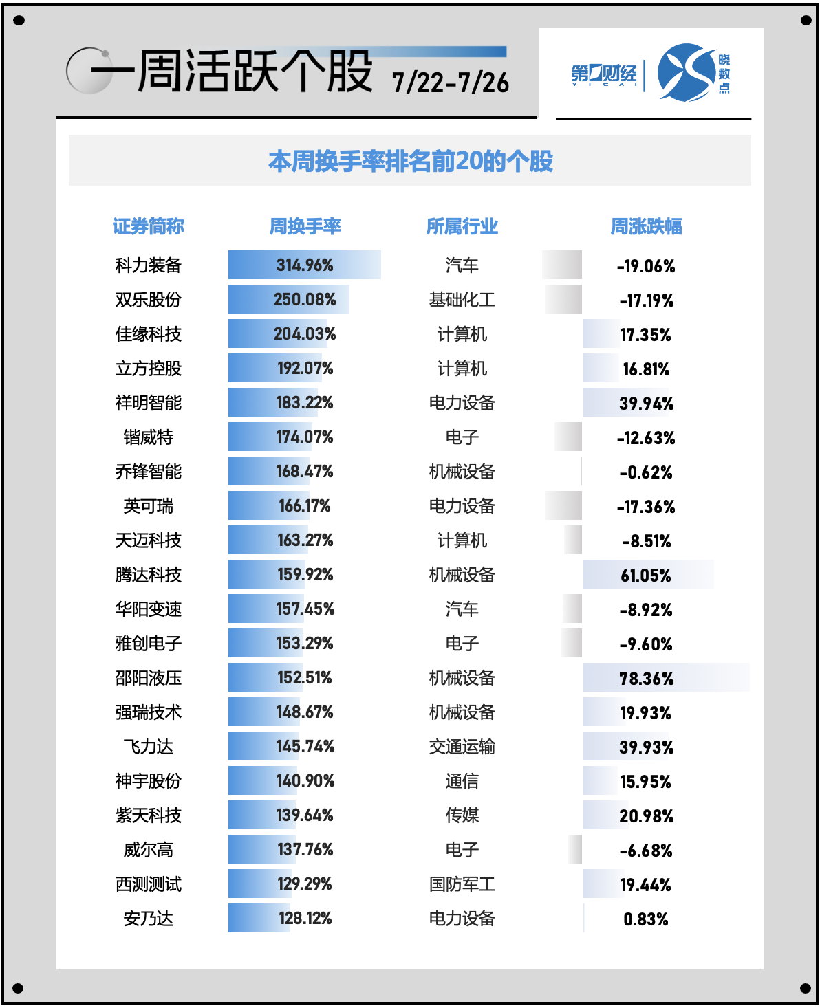本周活跃度前十个股名单出炉,37股累计换手率超100%本周活跃度前十个股名单出炉,37股累计换手率超100%