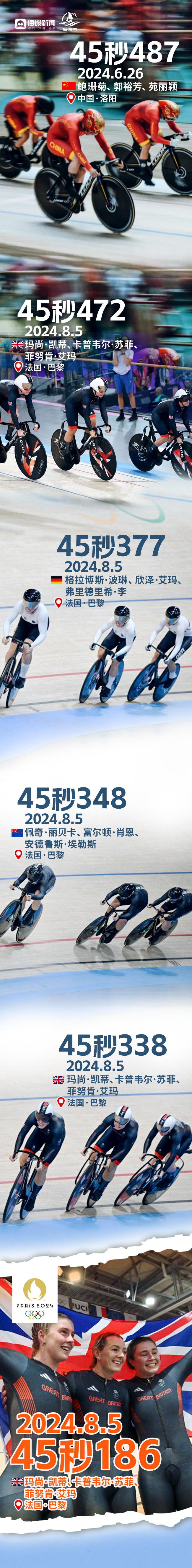 8月5日下昼5点,在巴黎奥运会相貌自行车女子团体竞速赛初赛中,英国队的玛尚·凯蒂、卡普韦尔·苏菲、菲努肯·艾玛以45秒472的收获刷新天下记载。
